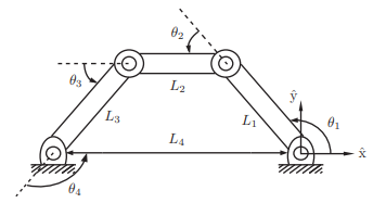 책에서는 holonomic constraint의 설명을 위해서 아래의 planar four-bar linkage를 예시하고 있다.